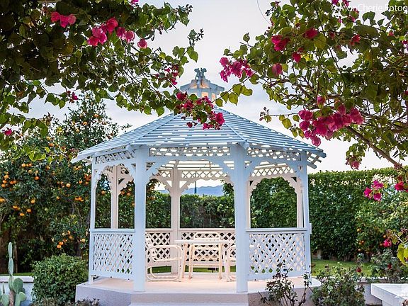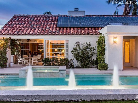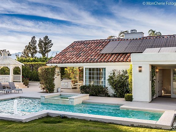 Price Reduction! Treat yourself! This -THIS- is what relaxing, recharging, & luxuriating looks like! Float in yr priv pool, soak in the spa, or drink Mint Juleps fr covered patio watching the children frolic in the water. Take Tea time or Happy Hour in the Gazebo and enjoy the sunsets! SW leisure affords views of the Santa Rosa Mntns -simply breath-taking! Priv, manicured yd teeming w/Citrus. Across frm world-renown IW Tennis Gardens. A Community Clubhouse, tennis courts, community pool, meeting rooms, &much more is all included in this gated community. BEST YET, do not fear Edison Power company because this home has a paid in full solar system! This owner has NO BILLS. Unbelievable, but true. Plus, this home comes fullyfurnished, turn-key ready for you. 1st flr MBR opens to covered patio, 2 addt'l BR w/queen &bunk beds. Many conv.built-ins. A light, bright totally workable flrpln, spectacular views, & priv oasis for recharging. Strong rentl history