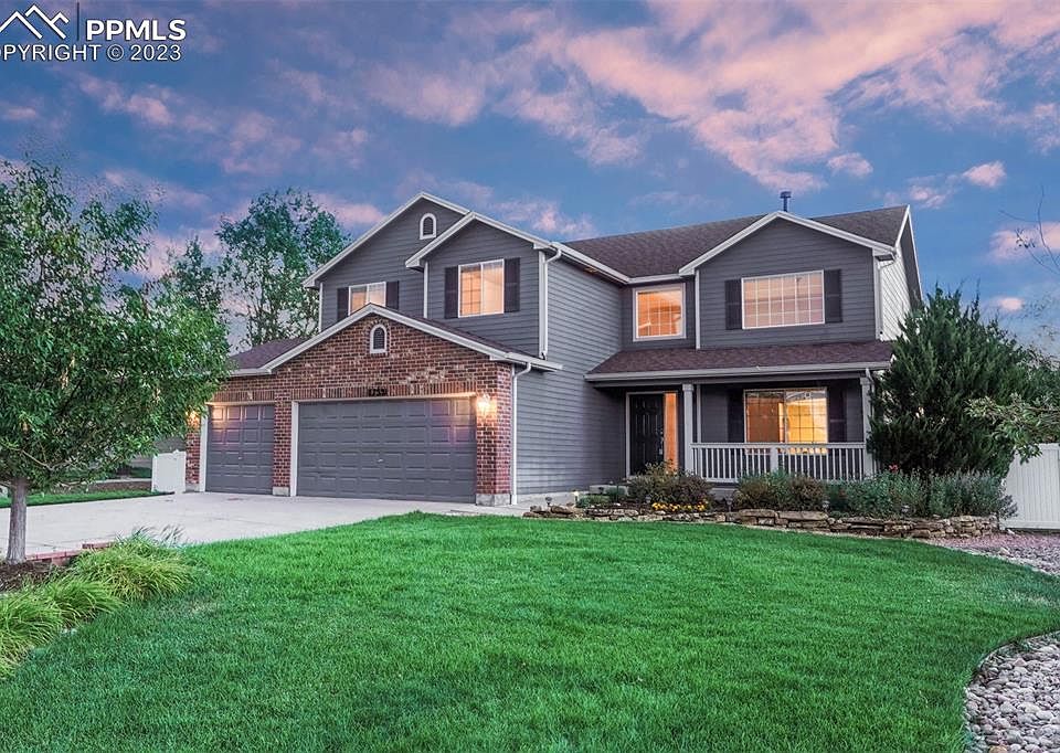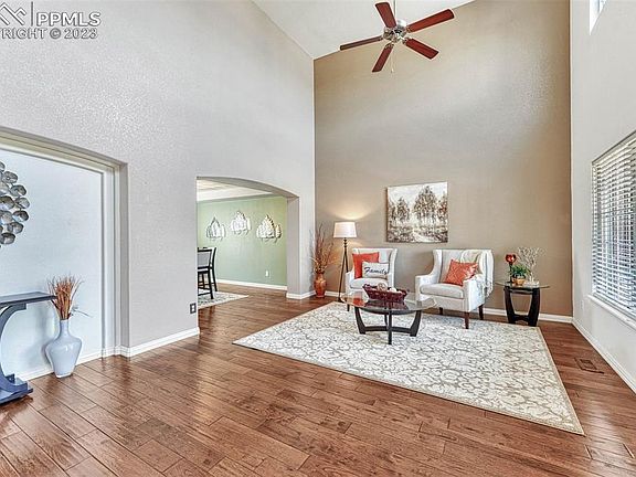 Woodmen Hills upgraded home on an amazing half acre landscaped fenced lot w/above ground pool! Covered front porch to enjoy the Colorado sunshine. Central air. Gorgeous wood floors through much of the ML. Tiled entry into Living Rm w/soaring ceilings & CF. The Formal Dining Rm has a coffered ceiling w/access to the Kitchen. The Island Kitchen offers a pantry, planning desk, upgraded cabinets w/pull outs, granite look countertops & a counter bar & dining nook for informal dining. A newer Anderson slider door takes you to a backyard deck for outdoor dining & relaxation. Newer appl include newer french door refrigerator, smooth cooktop, dishwasher, built-in microwave, & double ovens. The Family Rm features lofty ceilings, a CF, TV recess, & gas log fireplace w/blower. French doors lead into the ML BR/office with walk in closet. Powder Bathroom for guests. The hallway off the Kitchen has access to a 3-car garage & the Laundry Rm which includes a tile floor, cabinets, & washer/dryer that stay. The UL hosts a Loft, 3BRs, & 2BAs. The Loft has a walk-in closet & can be used as a den, office, or convert to a 5th BR. The spacious Primary BR features a lighted CF, shoe closet, & 5pc bathroom w/tile floor, dual sink vanity, mirror, soaking tub, separate shower, & walk in closet w/organizer system. 2 more BRs share a Full Bathroom w/ vanity, mirror, & tiled tub/shower. The Bsmt offers a large crawl space & plenty of unfinished space for your personal design. The backyard is an entertainer’s delight w/a newly refinished deck, covered pergola, an expanded stamped concrete patio, relaxing water feature, flagstone walkway, & storage shed for tools & toys. Plenty of trees and plantings create a backyard paradise. Spend summers in the 2022 15 ft above ground pool w/sand filter, ladder & vacuum system. The bsmt large safe and chest freezer stay. Woodmen Hills offers 2 recreation centers w/indoor & outdoor pools, 4 parks, exercise & fitness classes, & hiking & walking trails.