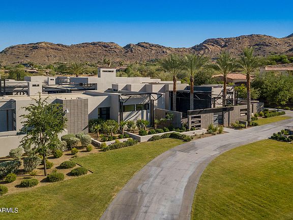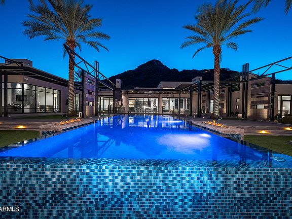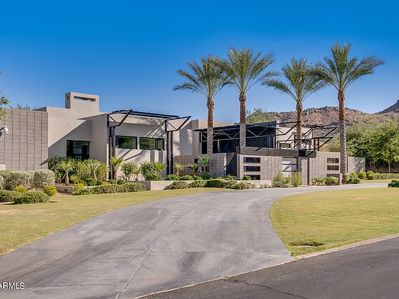 This modern-style estate designed by architect Luis Antonio Bonilla in Paradise Valley, AZ seamlessly merges indoor and outdoor spaces with movable glass doors and floor-to-ceiling windows. Built on just over two acres, it offers 15,000 sq ft of living space including 5 bedrooms, 8 bathrooms, a sunken great room with a 2 motorized pocket doors, formal dining room, expansive gourmet kitchen, breakfast room, man cave/lounge with wet bar, billiards & golf simulator, cardio mezzanine overlooking an indoor basketball court w/a retractable batting cage, home gym, 13-seat home theater with snack bar, gated four-car garage, 827 sq. ft guest casita w/ a separate entrance and much more. Outdoor features inc. over 20,000 square feet of artificial turf....