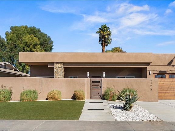 Immaculate turnkey home LOCATED ON THE GOLF COURSE in Palm Desert Country Club. Exquisitely remodeled in 2018 into a highly updated desert modern stucco architectural showpiece with stacked stone accents inside and out. Step into the expansive interior from a walled front deck patio area that ensures privacy from the street. Very flexible floor plan featuring a centrally placed Kitchen & expansive Great Room with large Dining Area and step-down Wet Bar all spaciously open to one another. Living area is filled with light from a very unique, large central open beam & skylight ceiling recess. Incredible 180 degree golf course & mountain views from expansive sliding glass doors & windows opening from the Great Room & Primary Bedroom onto the shaded north-facing showcase rear yard. The pebble tech POOL & SPA surrounded by ample stamped concrete decking, a covered patio with crushed glass fire feature and poolside al fresco dining area create the perfect rear yard haven! Both spacious Bedrooms are en suite with their own private Bath. Entertain guest around the huge island in the chef's Kitchen generously outfitted with ample custom cabinetry, 48" stainless steel dual fuel Thermador range with 6 burners, a grill and 2 ovens, Viking stainless steel interior dishwasher, Viking microwave, Bosch refrigerator/freezer, 2 sinks and stone countertops. Primary Bedroom Suite features a large en suite bath with huge walk-in shower and a couple's soaking tub surrounded by custom tile, dual basins recessed into stone countertops and unique skylight and open beam ceiling. Bedroom Suite 2 opens onto the private walled front patio area and its en suite Bath is lavished with an absolutely massive walk in shower adorned in custom tile surrounds. The 3rd full Bath in Living Area offers potential to create a 3rd Bedroom/Den by integrating the existing Dining Area into the already massive Great Room & Kitchen area. This home is lavished with tile flooring throughout: large, slate plank tile flooring in living areas & Baths and contemporary wood plank looking tile flooring in the Bedroom suites. Ultra low maintenance landscaping. Solar power panels are owned. Convenient direct access to laundry & utility areas in attached Garage from living area. Amazing location nearby shopping, entertainment, education centers. medical facilities, 1-10 freeway and highway 111.