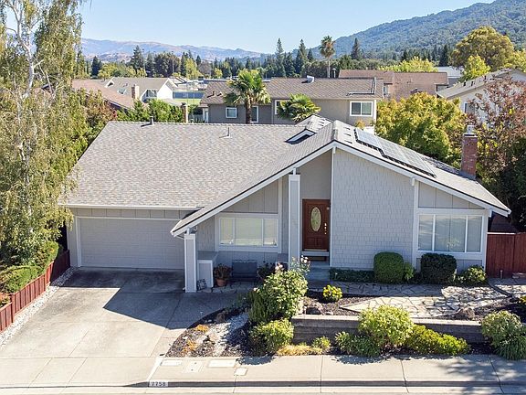 Oakhills neighborhood is tucked away on a quiet court with incredible views of the Pleasanton Ridge. Just minutes away from easy access to 580/680 freeway, top rated schools, including Foothhill High just two blocks away, BART and ACE train, medical facilities, shopping and dining at Stoneridge Mall and hiking trails. Step inside to gleaming hardwood floors that flow from the entryway through the dining room, kitchen, family room, and bedroom hallway. The vaulted ceiling in the living room and primary bedroom create an expansive and light-filled atmosphere. A sunken conversation pit creates an inviting retreat for quiet moments.The kitchen is the heart of the home, featuring a butcher-block island that doubles as a breakfast bar, and sleek stainless-steel appliances with a new induction stove.Overlooking the family room with views of the great outdoors, your private sanctuary awaits. A picturesque pool and serene foothill views set the stage for summer get togethers and evening under the stars. Beyond the kitchen and family room, a hallway leads to all four bedrooms and two full bathrooms. The greenbelt leads to the pool and playground, a great gathering place to meet new neighbors. The quality of life in Pleasanton is ranked #2 in the nation. Welcome to Home Sweet Home!