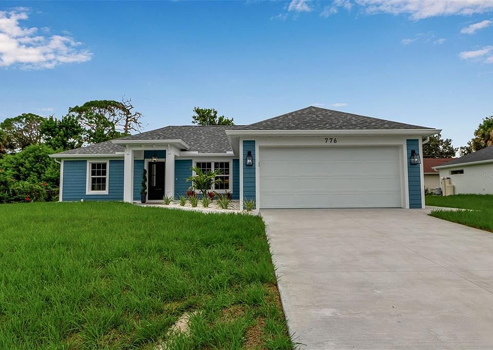 Welcome to the Morada at 776 Citrus Road — a Blue Water Custom Homes original that blends coastal charm, modern functionality, and timeless style in the heart of South Venice. From the street, this home stands out with its warm coastal blue exterior, accented by crisp white siding and trim. The inviting façade is complemented by a clean-lined covered entry and a wide driveway leading to the 2-car garage. Mature palms and fresh landscaping add to the relaxed Florida curb appeal. Inside, the cathedral ceilings create a grand first impression, filling the open living areas with light and volume. The great room flows seamlessly into the dining area and kitchen, forming the perfect backdrop for both everyday living and entertaining. Large windows and sliding glass doors frame the backyard and bathe the space in natural light, creating a bright, airy atmosphere. The kitchen features warm wood cabinetry, sleek quartz countertops, and a functional island that provides both prep space and casual seating without overwhelming the room. Stainless steel appliances, pendant lighting, and ample storage make this a space that balances style with efficiency. The dining area sits just off the kitchen, framed by windows, creating a welcoming setting for family meals or gatherings with friends. The primary suite is privately positioned and highlighted by a tray ceiling, lending an extra touch of architectural detail. Its en-suite bath features dual vanities with quartz counters, a spacious walk-in shower with elegant tilework, and a generous walk-in closet. On the opposite side of the home, two additional bedrooms share a full guest bath finished with the same attention to detail—quartz counters, coordinating cabinetry, and stylish fixtures. The laundry room, located off the garage entry, is bright and practical, offering plenty of space for organization and everyday use. At the rear, sliding glass doors open to a covered lanai—a peaceful outdoor extension of the home, ideal for morning coffee, evening cocktails, or simply enjoying the Florida lifestyle. The backyard offers plenty of room for personalization, whether you envision tropical landscaping, a garden, or a future pool. Located in South Venice, this home offers both convenience and flexibility, with no HOA, no CDD fees, and no flood insurance requirement. Residents also have the option to join the South Venice Civic Association, providing access to a private beach ferry, community boat ramp, and local park amenities. The location is just minutes from Shamrock Park, the Venetian Waterway Trail, shopping, dining, and the Gulf Coast’s world-famous beaches. As with every Blue Water Custom Home, the Morada is crafted with care and protected by a 2-10 Home Buyers Warranty for long-term peace of mind.