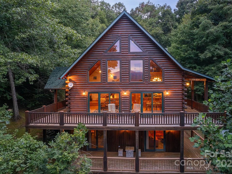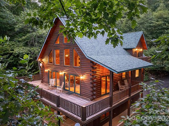 Immaculately kept three bedroom, three and a half bath log home in gated Mountain Heritage Preserve. A private estate on 8.72 acres, overlooking the creek, just a couple minutes from the four-lane highway. Southern, multilayered views from the expansive decks on the upper and lower level. Every interior detail was custom designed with stunning wood work, beams, and ceilings. Two gas log, stone fireplaces, one in the great room and one in the master suite. Two upstairs bedrooms have exterior decks of their own to sit and enjoy the morning air. Downstairs offers a one car garage, a full bathroom, a second living area, lots of storage and a work bench/workshop. Paved roads to the door with great natural landscaping to greet you. The home is being sold fully furnished with high end furniture. Come see this masterpiece and how handy it is to Sylva, Dillsboro, Cherokee and all the mountains have to offer!