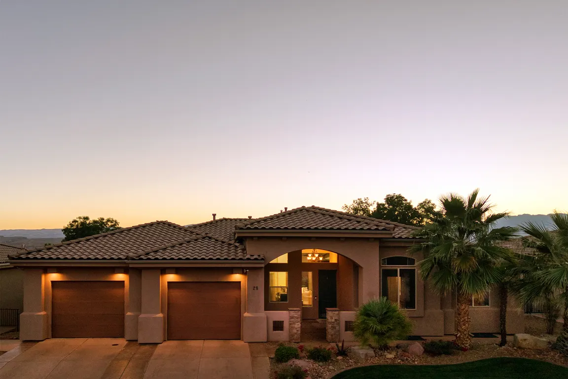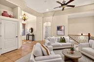 Located on corner-lot in Desert Color, this upgraded modern Spanish resort home offers - Smart home technology - bidet toilets - EV charger - Oversized 2 car epoxy garage - Concrete golf cart pad - 2 balconies - Permanent holiday lighting - 2 x 6 exterior walls - 10'ceilings, ... and ...