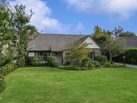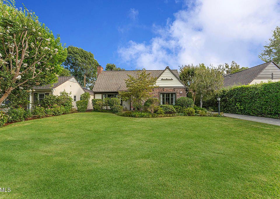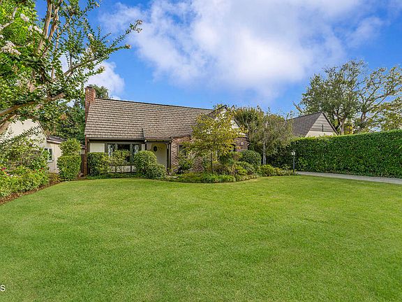 Nestled on a quiet street in San Marino's highly desirable Mission District, this English Cottage evokes the timeless charm of the countryside. With its steeply pitched roof, aged brick facade, and diamond-pane windows, the home radiates warmth and storybook appeal. A paver stone walkway meanders through lush flower beds to the inviting porch featuring arched wood beams that accent a vintage paneled door create a welcoming prelude to the home. Beyond the entry, built-in shelves and a petite view window lead into the dramatic living room, revealing soaring vaulted ceilings with exposed beams, gleaming hardwood floors, anchored by a striking stone fireplace with raised hearth and rustic wood mantel. A French door opens to the side patio, blending indoor and outdoor living. The formal dining room, illuminated by an opaque glass chandelier and abundant natural light, opens to the sunny breakfast room featuring a wrought-iron chandelier adorned with hand-painted ceramic accents, walls of cabinetry, a convenient prep sink, and a tiled serving counter that connects seamlessly to the kitchen--perfect for casual meals or morning coffee. The functional kitchen is appointed with tiled countertop, matching backsplash, and custom cabinetry. A versatile mudroom with laundry and an adjoining three-quarter bath adds everyday convenience, while a side door opens to the paver driveway that leads to the detached garage. A central hallway leads to the home's private quarters, where one bedroom features a walk-in closet and French doors to the side patio. At the end of the hall, a flexible primary suite can be closed off for added privacy and offers double closets, tranquil views of the backyard, and a primary bath with dual sinks. A third bedroom doubles as an office or den, enhanced by built-in bookcases and French doors that open to a wisteria-draped pergola--an enchanting setting for dining al fresco. The private backyard unfolds as an oasis of relaxation and leisure, with a sparkling pool surrounded by lush hedges and mature trees, offering the perfect retreat for lounging by the water or gathering with friends on warm evenings. Combining classic English charm with the best of California living, this quintessential cottage is truly your home sweet home!