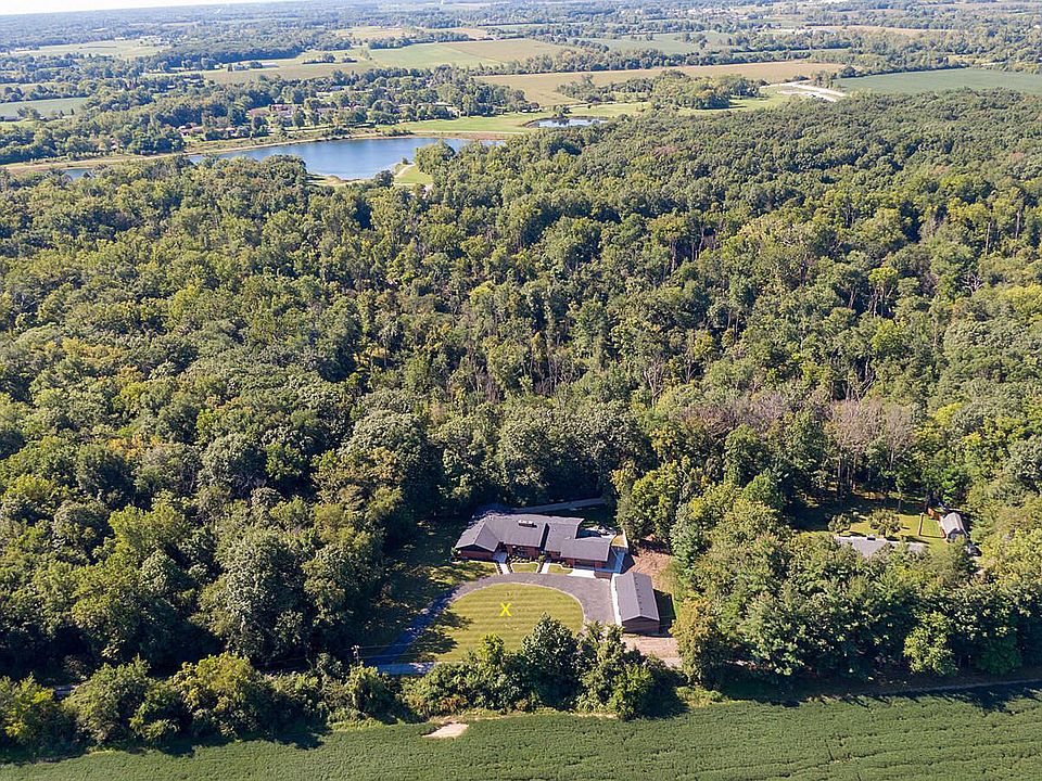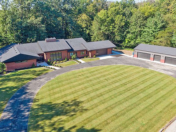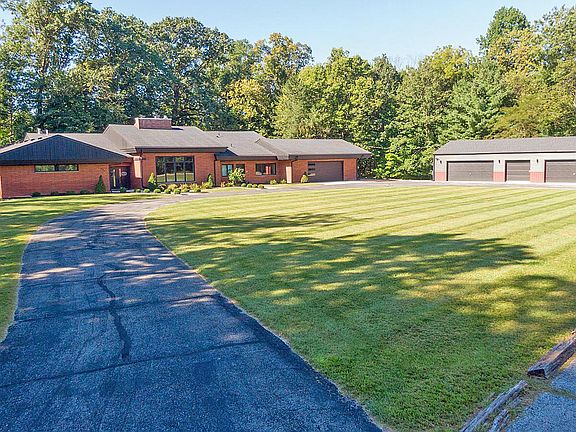 Your own little world...Unique architectural Design reminiscent of famous Frank Lloyd Wright. Nature views abound=Sprawling, timeless red brick, RANCH home. Secluded setting, nearly 5 acres, mostly wooded land, perimeter boarders Deep River & adjacent properties include protected Preserve & farmland. Follow a winding road to circular driveway to accommodate guest parking for seasonal gatherings. 3960 SF Home on a slab, offers 3BR's, 3baths, 3seasons rm, 2.5 car attach garage (another 754 SF w/pull down stairs/attic access). PLUS 4 car (57x26) detach garage w/home office & hanging racks & cabinets. Open concept design flows seamlessly for entertaining. Enter spacious Foyer w/unique art deco recessed light. Walls of windows everywhere w/unbelievable views from every room, even the baths! High ceilings throughout. Easy care luxury plank vinyl or tile floors, BR's have plush carpet. Stunning European Style Kitchen w/soft close cabinets, under shelf accent lights, newer stainless appliances & deep farm sink w/disposal button, stunning countertops & massive island w/waterfall quartzite counters. Handy Butlers Pantry area & wine fridge in FDR off Kitchen. Dramatic Red Brick Walls w/Fireplaces in both front LR & rear FR. 39x13 covered patio access by multiple doors. Fenced yard. Large stone paved patio extends entertaining space. Conduit & gas lines already run to patio to add future outdoor kitchen. Hall to 3 BR's features long wall of lovely custom built-in's! Picturesque 3 seasons rm w/heater FP & doggie door. Awesome Master Suite w/ patio access. Walk-in closet, Barn Door entry into Lavish MBA w/walk in rain shower+ big window and a seat. Floating double vanities. Laundry w/sink & cabinets off FDR, Stackable W & D stay. Roof, & 2 Zone HVAC & A/C Units (Trane), & 2 HWH were new in 2021. Septic pump Spring 2025. 200 amp electric. Sep. electric in detach garage. Bosch DW 2024. Resort living awaits discerning buyers. Showings by appt. w/ADVANCE Notice please. Call Today!