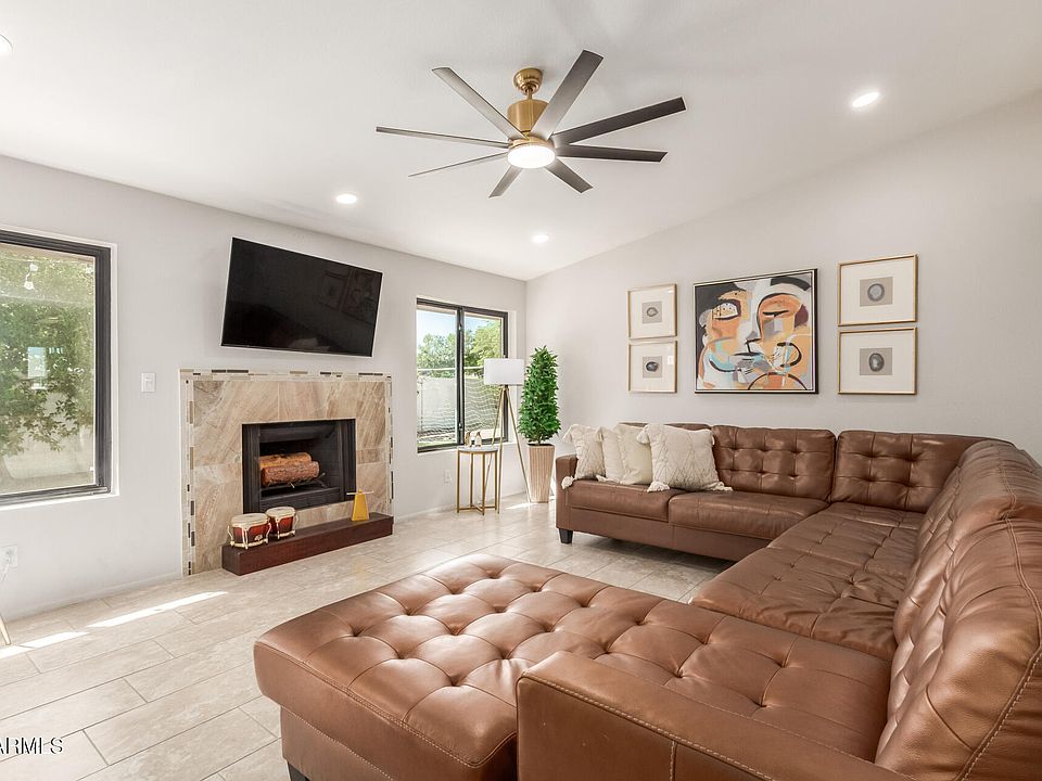 Tiled fireplaceInviting layoutWell-appointed kitchenSerene main bedroomPlenty of natural lightTile backsplashMaple cabinetry