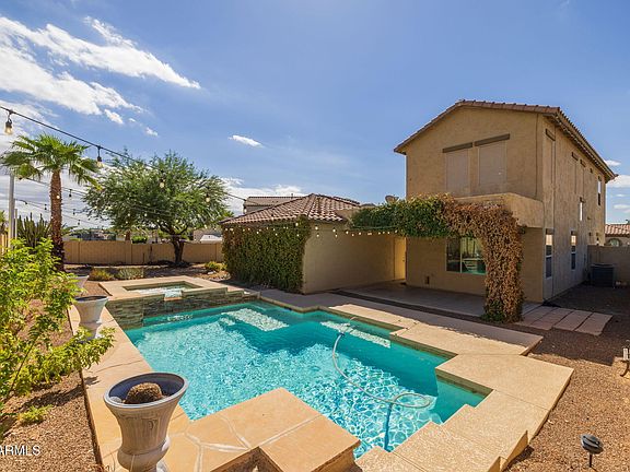 Step outdoors and experience Arizona living at its finest. The oversized backyard is a true oasis with a heated pool and spa with water feature controlled by a modern digital system, professional bistro lighting that casts a year-round glow, and mature greenery for added privacy. A large covered patio and basketball play space make the yard perfect for gatherings. The detached 2-car garage features brand-new epoxy flooring, while the extended paver driveway and gate provide parking for up to eight vehicles.