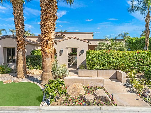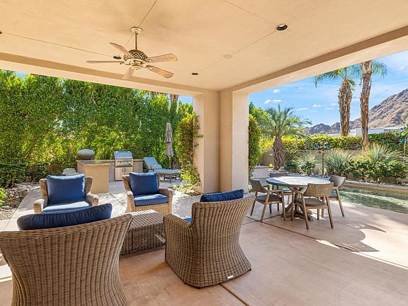 Built by renowned Ministrelli this outstanding home is one of the finest and best locations at Indian Wells Country Club within the prestigious Villaggio community. Light and bright California open floorplan and Tuscany design is quality built from start to finish! Spectacular Mountain Views directly south facing with walls of glass which disappear and open to large 422 Square Foot covered loggia with fireplace, beautiful pool and raised spa, and outdoor barbeque island. Fabulous Views and spacious indoor/outdoor living, this private home features 4632 Sq. Ft. of indoor living, 4 spacious Bedrooms with ensuite baths, 4.5 Baths, Great Room with fireplace, Formal Dining Room has adjoining impressive Wine room. Open Gourmet Kitchen boasts 2 islands with bar seating, 2 stainless steel sinks, Wolf appliances, and gorgeous granite countertops. Primary bedroom has fabulous pool and mountain views with French doors to direct access to loggia, pool/spa. Grand Primary Bath features dual sinks plus vanity, jet tub spa, and huge walk-in closet. Interior Design features include extensive use of granite and marble, faux and stenciled wall paint, art niches, built-in wood cabinetry, carpeted bedrooms, and gorgeous Versailles pattern travertine floors. Total of 3 car garages, with epoxy flooring and built-ins for extra storage. Elegance, Style, and Luxury!