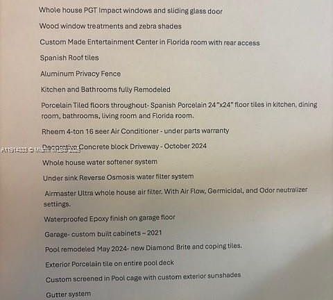 Beautifully upgraded 3-bed/2-bath pool home featuring PGT impact windows/doors, and a custom entertainment center in the Florida room. Home offers Spanish roof tiles, aluminum privacy fence, fully remodeled kitchen and bathrooms, and 24"x24" Spanish porcelain tile throughout. New decorative concrete block driveway (2024) and Rheem 4-ton 16 SEER A/C under parts warranty. Whole-house water softener, reverse osmosis system, and Airmaster Ultra air filter with germicidal and odor settings. Waterproof epoxy garage floor with custom cabinets (2021). Pool remodeled in 2024 with new Diamond Brite, coping, exterior porcelain deck, and custom screened enclosure with sunshades. Includes gutter system and exterior generator transfer switch. Move-in ready and meticulously maintained.