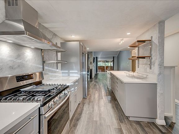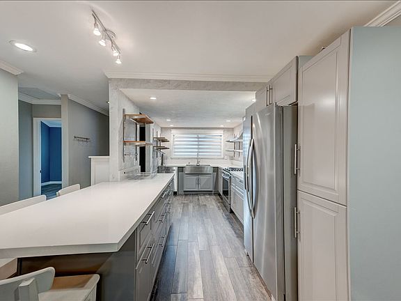 Updated kitchen with stainless steel appliances, ample storage with renovated cabinets and an island/bar setup with seamless connection to the living area, creating a spacious, airy feel.