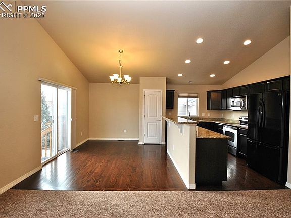 PRIVATE FULLY LANDSCAPED BACKYARD AND QUIET FRONT YARD!! Tile entry brings you into a great room of living, dining and kitchen areas. Hardwood kitchen and dining areas with Granite counters and all the appliances with carpeted living room featuring gas fireplace and vaulted ceilings. The rest of the main level includes New carpet and luxury master 5 piece bath suite. Full finished basement has 2 more large bedrooms and family room. Custom blinds, Washer/Dryer and Move in Ready. Big 3 car insulated garage, window well covers, Newer exterior paint and roof. Close to Peterson Air Force Base and Schriever Air Force Base and Woodmen Road.