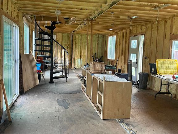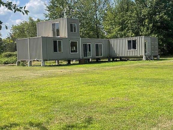 Two large bedrooms, two bathrooms and a bonus room upstairs, large living room space and kitchen area suitable for a large island a sliding doors overlooking the pond & island. The 2'' water tap is hooked up, 400 amp service, light fixtures have been purchased, the tub is in place, 4 mini splits, the walls have been insulated with spray foam, as well as the underside of containers, septic mound is installed, septic tanks are on site. Nine foot ceilings, and tons of natural light highlight this unique structure. There his a containers beyond the pond used as a shed, the container up front could be a studio or garage. Renderings offer a glimpse of how this could be finished. A weekend retreat, amazing rental or year round home awaits you.