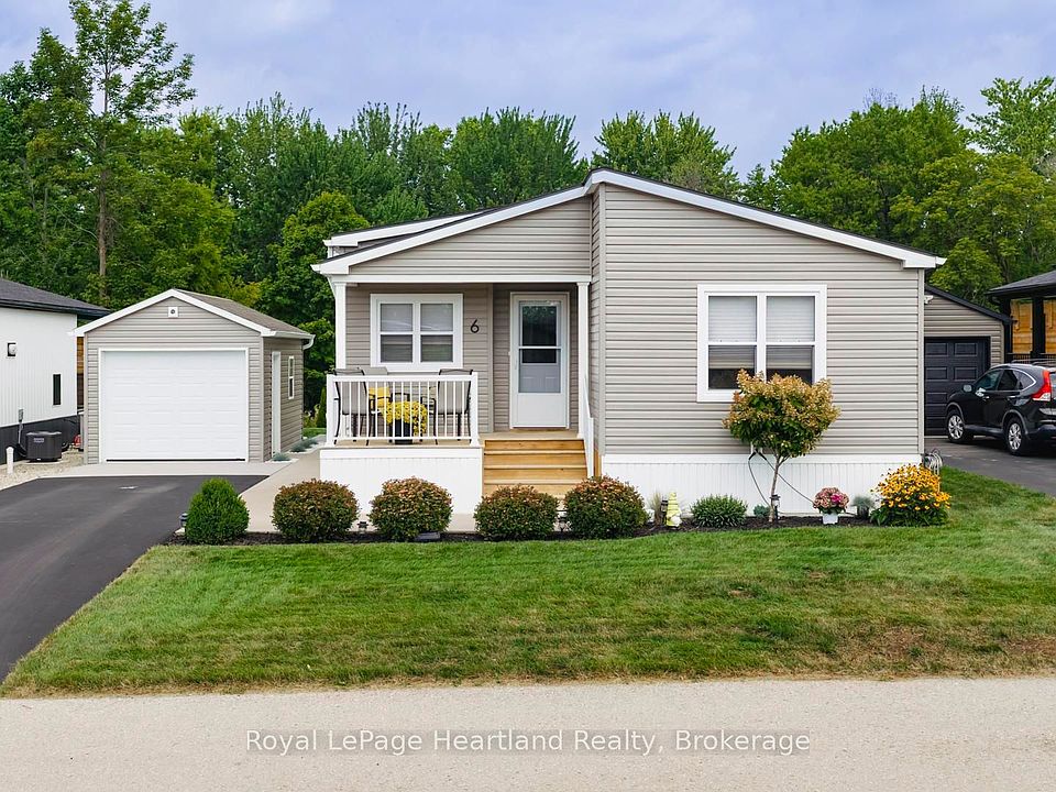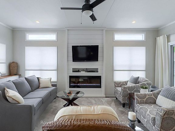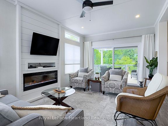 Here's a rare opportunity! Exclusive Location backing onto a beautiful ravine with trees at Bluewater Shores. Discover this spotless, like-new home in the sought-after Bluewater Shores land lease community. Tucked in a private setting with trees as your backdrop, you'll love relaxing on the covered back porch and enjoying the peace and privacy. Inside, the open-concept layout is fresh and modern. The kitchen features a large island, coffee bar, backsplash, and plenty of cabinetry. The living room is highlighted by an electric fireplace with a shiplap mantle, creating a cozy focal point. With 2 bedrooms plus an office, there's room for guests and a home workspace. Additional features include: forced air gas heating and central air, extended driveway, shed, eavestroughs, patio, gas BBQ and beautifully landscaped grounds, plus No HST on purchase. As part of Bluewater Shores, you'll enjoy exclusive amenities: private sandy beach with incredible sunsets, heated outdoor pool, clubhouse with indoor pickleball court, and a warm, welcoming community. Bluewater Golf Course is just up the road, and the charming town of Bayfield is minutes away. This move-in ready home offers the perfect blend of modern comfort and resort-style living.