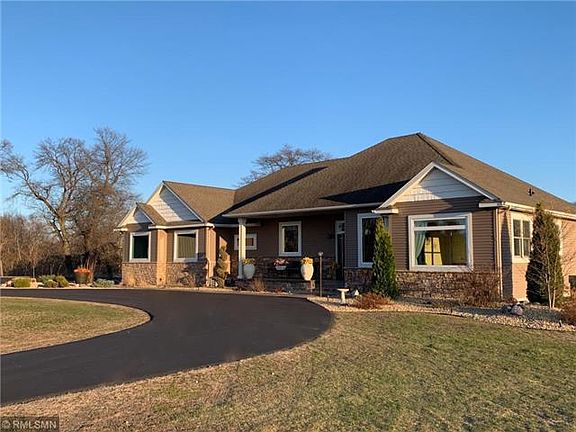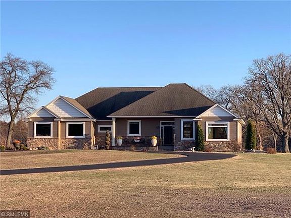 Impressive and expansive 4BR/4BA walkout rambler bordering Carlos Avery. Everything you're looking for! Open concept design with wonderful layout, expansive spaces, too many amenities to list. Main flr has a large living room with built-ins & vaulted ceilings, tile floors in kitchen,dining & entry. Kitchen has loads of cabinets & walk-in pantry, dining room walks out to large deck overlooking private backyard, main flr laundry, master suite has dual W/I closets & wonderful master bath, 2 BR's/office & 2 more baths on this level. Lower level has huge entertaining spaces, more office/flex room, wet bar, family/theatre room, multiple walkouts to patio area, in-floor heat, large BR(s) & full bath. 2 fireplaces, lots of built-ins, panoramic views. 3-car attach garage, paved circle loop drive, large outbuilding, and very nicely landscaped. Walk right out your back door to acres and acres of public land & lots of wildlife. Easy access to I35. (5 acres includes dedicated road right of way.)