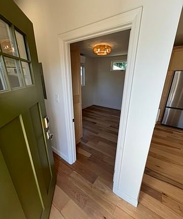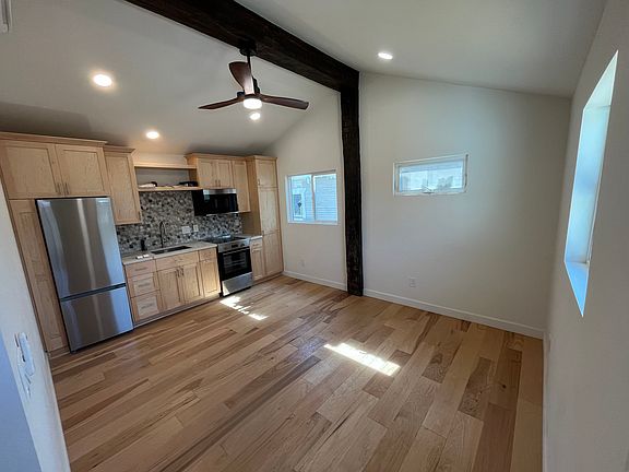 Inside, you'll find hardwood floors throughout, mini-split A/C and heat, and a completely new kitchen with stainless steel appliances including oven, microwave, refrigerator, garbage disposal, and plenty of storage. The bedroom features a built-in closet system, and the bathroom has a sleek vanity, modern tile tub/shower, and extra shelving. A stacked washer and dryer are included in-unit for your convenience.