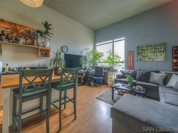 The Lofts @ 777 Sixth Avenue is the perfect location for Downtown living. Its located adjacent to numerous luxury shopping, restaurants, and nightlife venues. A short walk to Gas Lamp, the Waterfront, and Petco Park. This is a top floor unit that features high ceilings that provides an open air feeling. The open floor plan where the living room, dining area and kitchen flow seamlessly together maximizes the living space. The kitchen features plenty of cabinets and counter space for all your cooking and entertaining needs. It offers extra open shelf space with an eat-at center island. There is a private bedroom set apart as a partial loft and lots of creative storage areas. The in-unit stackable washer and dryer offers privacy and convenience. There are great views of the city lights from the living room and common areas. This is a secure gated community with a guard that is located in the heart of Downtown. Very low HOA fees compared to the market, but still provides a fully-equipped fitness center and beautiful common area. The location of this unit as well as the layout, condition, and charm make this unit highly desirable if you want to enjoy all that San Diego has to offer. Pictures are from a previous listing. Flooring has been changed and the kitchen cabinets need repaired on one side.