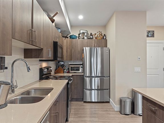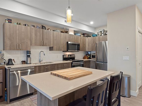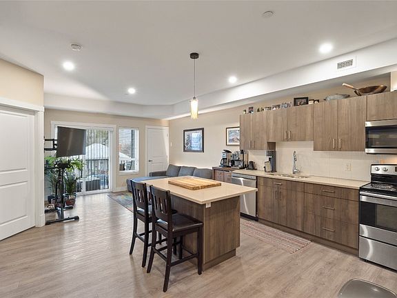 Welcome to this modern 1-bedroom + den condo, perfectly situated near the heart of downtown—close to everything you need, yet tucked away in a quiet pocket of the city. Built in 2017, this home blends comfort and convenience with a bright, open layout that makes the most of every square foot. The kitchen features sleek stainless steel appliances and a functional island that adds both extra workspace and a casual spot for dining. Large north-facing windows fill the space with natural light while keeping the home comfortably cool in the summer months. The den offers flexible space for a home office or cozy guest nook, while in-suite laundry and a recently serviced A/C unit add everyday ease. Step outside to your private deck for morning coffee or evening views, or take advantage of the building’s thoughtful amenities—including a large common room perfect for hosting larger gatherings, secure bike storage, a personal storage locker, and a parking stall. Pets (1 cat or small dog) and rentals are welcome, making this an excellent choice for both homeowners and investors. Modern, low-maintenance, and close to shops, restaurants, trails, and the river—this downtown condo offers the best of city living with a calm, comfortable edge.