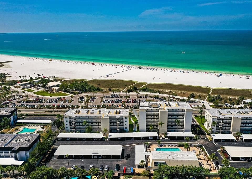 PERFECTLY RENOVATED AND RARE TURNKEY OPPORTUNITY on the 5th Floor of Building 777 in Sought After & Gated CRESCENT ROYALE! As you walk through the door, you’ll be "wowed" with the direct view of the Gulf of Mexico & Siesta Key Beach! Stunning full gulf views, beachfront fun, fabulous amenities and nearby activities from this turnkey furnished end-unit with outstanding rental income potential. Siesta Beach, well known for its incredible sunsets, pristine quartz sand, and beautiful turquoise water, is directly across the street. This FULLY RENOVATED AND FURNISHED, 2 bedroom, 2 bath condo is located in Crescent Royale, a welcoming community in close proximity to all of the shopping, restaurants, and amenities that Siesta Key has to offer. You will love this unit from the moment you enter. This 5th floor end unit offers a full open concept plan, a brand new kitchen that is not only fully soft-close, but also features pull out cabinet shelving, Quartz countertops and new appliances. The main area boasts wood-look plank tile and a hurricane impact sliding glass door that leads to a spacious screened lanai. The primary bedroom is large enough for two queen beds which fit comfortably in the space to maximize rental income. The en-suite bathroom has also been fully renovated with new cabinetry, counter tops, fixtures and walk in-shower with gorgeous new tile. If that’s not enough the second bedroom in this split plan offers two twin beds as well as a beautiful, brand new bathroom with walk in shower. Every inch of this condo has been cared for, A/C with UV system 2016, water heater 2017, all kitchen appliances 2021. When you are ready for a day at the beach there is a storage locker for all your beach gear, conveniently located next to the elevator. This unit is completely move-in ready, just bring your flip-flops and your toothbrush! Generating income is a breeze, you can either rent the property yourself or with the on-site full-service manager. One-week minimum rentals are allowed, this unit sleeps up to six. Security Gates & paved entryway will greet you upon entering and you'll have your own, assigned covered carport space. You’ll be greeted with a professional and friendly staff from management to maintenance on site who handle all aspects of property management. Crescent Royale also features a new state-of-the-art fitness center, gas grills & tables with umbrellas for a cookout, shuffleboard court, Olympic style heated pool, pool table in the air-conditioned lounge, elevators, recreation room & a handicap accessible banquet room with a kitchen. Move-in this comfortable & stylish condo or cash flow it as a rental (or both)! You are only steps away from the #1 Beach in the USA "Siesta Beach". Walk to Siesta Key Village or jump on a trolley to enjoy a nice meal or go shopping. Plenty of things to do on Siesta Key ... rent a bike/scooter/kayak for a day and there are many fine restaurants to dine at! Weekly rentals make it very popular for investors or make this your 2nd home or your Sarasota get away in between tenants. All three buildings in Crescent Royale have passed the Milestone Inspections, and the budget is financially stable.