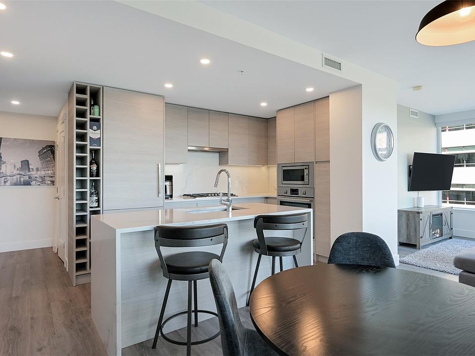 Corner unitCity and ocean viewsOpen layoutLarge windowsIntegrated bosch appliancesQuartz waterfall countersSoft-close cabinetry