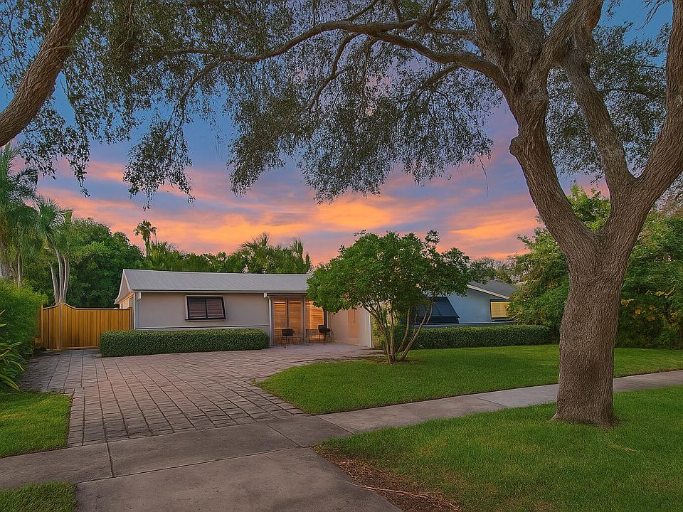 Fenced yardWonderful floorplanSplit-bedroom layoutLush palmsLarge windowsShady oak canopyMetal-look roofline