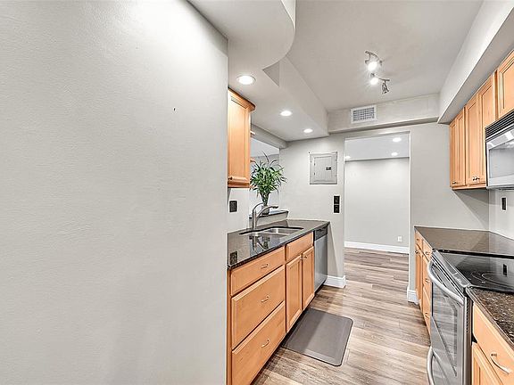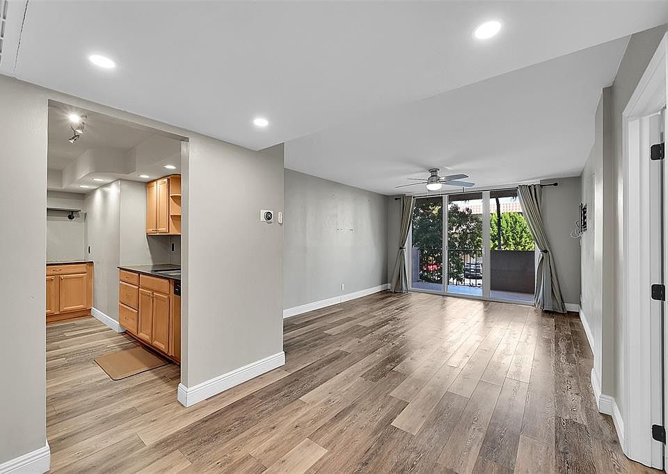 Ensuite bathroomOpen living spaceDark stone countertopsSplit bedroom floor planLight wood-style flooringRecessed lightingStainless steel appliances