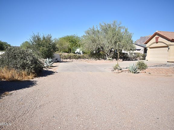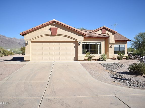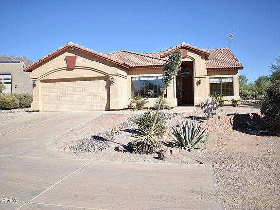 First time offered on the MLS! Views right in your backyard of the Superstition Mountains! NO HOA, over an acre of flat acreage with the possibility of adding your own additions-Room for a huge separate garage, horse stalls, you name it. Interior has a great floorplan, nice open kitchen and living room, central vac, metal security closures on entry and rear doors. Primary bedroom has its own exit, soaker tub and separate shower and toilet room. Large walk in closet and double sinks. Formal Dining right off the kitchen, laundry room and large garage with added cabinets and its own exit as well! Tons of potential so call now for your personal tour and make this home your own!!