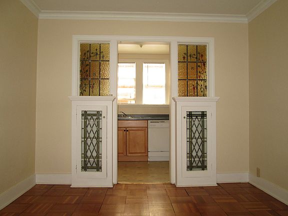 Stained glass windowsHardwood floorsCeramic tiled bathMaple cabinets