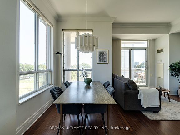 Premium lower-penthouse corner suite with an exceptional two-bedroom layout, soaring 10-ft ceilings that create a modern, luxurious feel, and full southeast exposure for all-day light. Nearly 1,000 sq ft plus a large wrap-around balcony for seamless indoor-outdoor living. Modern granite-island kitchen with stainless appliances, plenty of storage and a bright breakfast/office nook. Spacious dining area fits a full-size table and flows into the living room with balcony walkout. Primary bedroom features a walk-in closet and private ensuite. Move-in ready with laminate floors throughout and the convenience of ensuite laundry. Peacefully set on the quiet side of the building, with no unit next door and away from elevators. Includes a premium parking space and locker beside the elevators. Boutique building offers a welcoming lobby, gym, and party room. Steps to Metro, FreshCo, cafés, restaurants, York University, and direct bus service to Finch and Downsview stations.