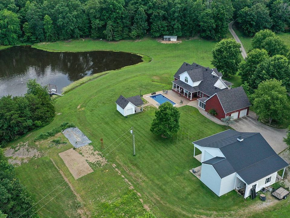 Luxury meets country living in Marion County, Kentucky. Welcome to your dream estate--an expansive home set on 29 picturesque acres of rolling hills, dense woods, and a serene private pond with a dock and fountain. The 5 bedroom, 5 bath beauty blends elegance, comfort and outdoor charm like no other. Inside, enjoy a stylish mix of modern and traditional touches: tray ceilings, sunlit rooms, and a showstopping multicolored wood accent wall perfect for a home office or music space. The gourmet kitchen features oak cabinetry, and stainless steel appliances, while multiple living and dining areas offer endless space for entertaining or relaxing. The luxurious primary suite is a true retreat, and the home boasts many closets--including a bold walk-in with built ins--plus well appointed baths, cozy fireplaces, and unique finishes throughout. Step outside to your private paradise: a stunning in-ground pool with a slide and a pool house with its own lounge and bath. In addition you will find a huge two car attached garage and an awesome workshop that is boat or camper friendly. This one is the perfect mix!!! Live grand. Relax deep. Entertain effortlessly. Welcome home.