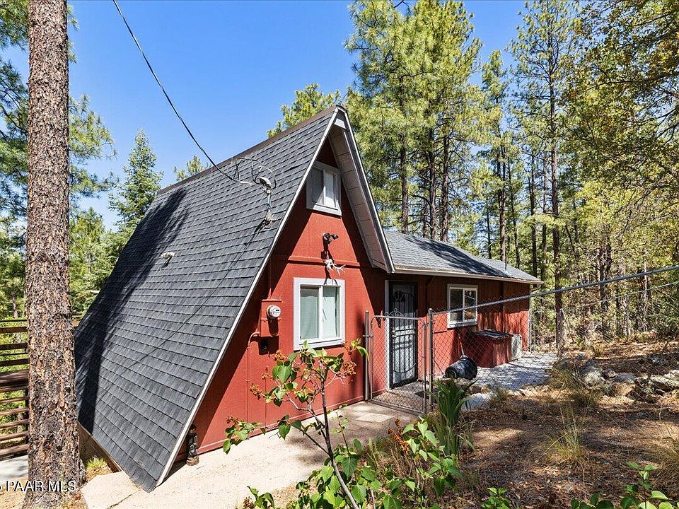 Surrounded by whispering pines and the unspoiled expanse of Prescott National Forest, this inviting A-frame cabin sits on a tranquil half-acre lot, offering year-round mountain beauty and a true escape from the everyday. The spacious deck invites you to breathe in the fresh scent of pine while enjoying peaceful views of the surrounding forested hills. With cool summer breezes and snow-dusted peaks in winter, this home is a haven in every season.Inside, the foyer leads to the heart of the home--the kitchen--where tongue-and-groove wood ceilings, wood-look tile flooring throughout, updated plumbing and fixtures, renovated cabinetry, and a sleek stainless steel smooth-top electric range blend modern convenience with cozy cabin style. The inviting living room is bathed in natural light from a large sliding glass door that frames a stunning forest view, creating a bright, relaxing space perfect for unwinding or entertaining.Two bedrooms are located on the main level, both with tongue-and-groove ceilings for added warmth and character. One features a newer sliding glass door opening to the outdoors, offering a private connection to nature, while the second provides access to a hidden loft via pull-down stairs--ideal for guests or a quiet hideaway. The full bathroom includes an upgraded window and a linen closet for extra storage.Classic A-frame architecture is enhanced by freshly repainted siding, a newer roof (estimated under 10 years old), and several new Milgard windows for improved efficiency and style. Beneath the cabin, the enclosed underside has been spray-foam insulated, with recently replaced floor beams and nearly all new PEX plumbing. The leach field features an efficient infiltrator system for low-maintenance living. Additional storage is located under the deck, and the flat parking area accommodates multiple vehicles.Year-round access is easy via a county-maintained, snow-plowed road. Upgraded HVAC mini-splits ensure efficient climate control, and two additional Milgard windows are included for future loft installation. Thoughtfully updated and lovingly maintained, this mountain getaway combines comfort, character, and an unbeatable setting--right at the edge of National Forest land.