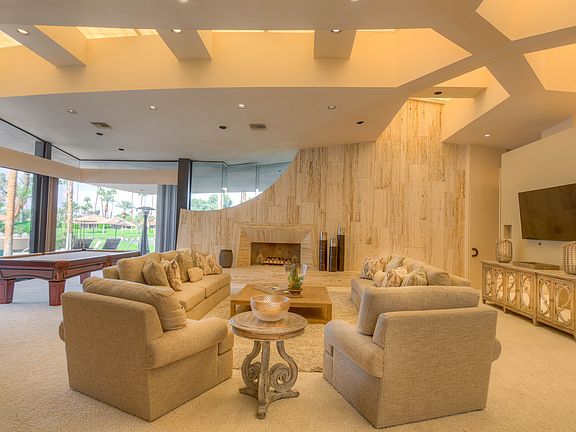 Spectacular in every sense from the stunning Contemporary Architecture, Serene Setting, Recreation and Value, this Country Club Estate has it all. Tucked in the back of Indian Wells C.C with NO HOA yet golf course lake frontage is the 1+ acre, 13,000+ sf private residence creatively designed around a massive outdoor entertainment pavilion with wraparound views. Intricate natural light streams into the Great Room with its walls of pocketing glass, architectural skylights, Travertine faced fireplace, full bar and exquisite dining room for at least 18. The fully updated kitchen/Family Room is perfection with double islands of dramatic, high gloss cabinetry & Miele appliances, lg. eating area, wet bar, buffet, walk-in pantry & desk ''command center.'' There's a centered fireplace and walls of glass open to the course, lake, mountains & pool. Opulent Primary Suite leaves nothing to be desired and you will awake to the most beautiful Views. Two more large suites in the Main House, each with luxury bathroom plus 1 Casita bedroom suite and a fully self-contained 3 room guest house with separate parking. A new catering kitchen has multi-slide glass doors designed for full cooking and entertaining. The pool is a custom piece of art and acts as the centerpiece for the yard. Setting is elevated above the 15th fairway of the golf course affording 180 degree views+. There are many specimen tress including unique fruit trees from India. An unmatched quality & overall living experienc