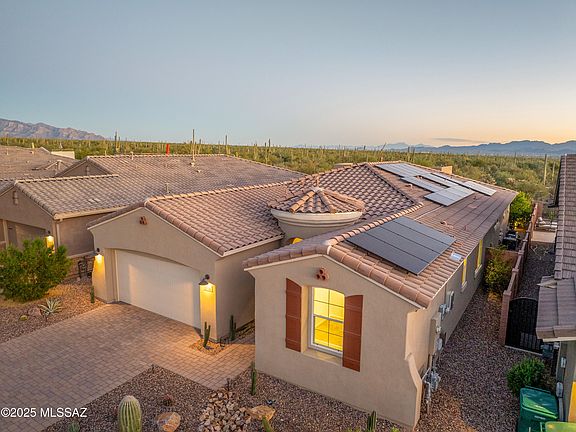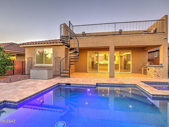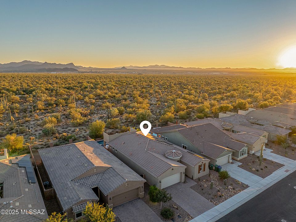 Presenting serene desert living in this exceptional home in the gated community of Blue Agave in Dove Mountain. An inviting open-concept layout showcases an oversized island flowing seamlessly into the great room, where 16-ft sliding glass doors blur the line between indoor and outdoor living. The primary suite offers a spa-like bath with an upgraded walk-in shower and a generous custom closet. A split floor plan provides guest privacy, while a den with glass doors creates the ideal home office or flex space. Step outside to your private backyard backing to a natural preserve, featuring a covered patio, sparkling pool and spa, built-in BBQ, citrus trees, and a winding staircase leading to an elevated sun deck with panoramic mountain and desert views. Upgrades include: premium preserve lot, pool & spa, oversized island, epoxy garage floor, owned solar, water softener & reverse osmosis system, smart-home lighting, coffered ceilings, upgraded insulation, paver driveway, laundry sink, upgraded network/Wi-Fi/cameras, tiled guest bath, and 8-ft interior doors throughout. The proximity to the Ritz-Carlton, top-notch golf, scenic hiking and biking trails, and access to shopping and I-10 make this home a convenient retreat.