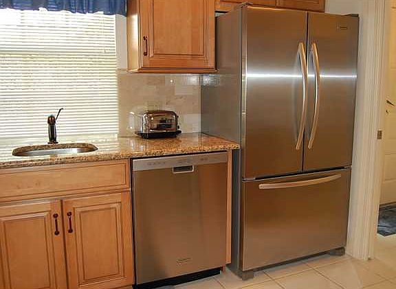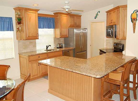 DiVosta extended Capri I on golf course with private view. Totally remodeled kitchen with stainless steel appliances and granite counter tops. under mounted stainless steel sink. Beautiful new cabinets with soft close drawers and doors. Tile throughout main living area. Additional built-in cabinets in garage for storage. Large screened patio with covered lanai. Accordion shutters all around.Furnishings Available