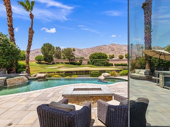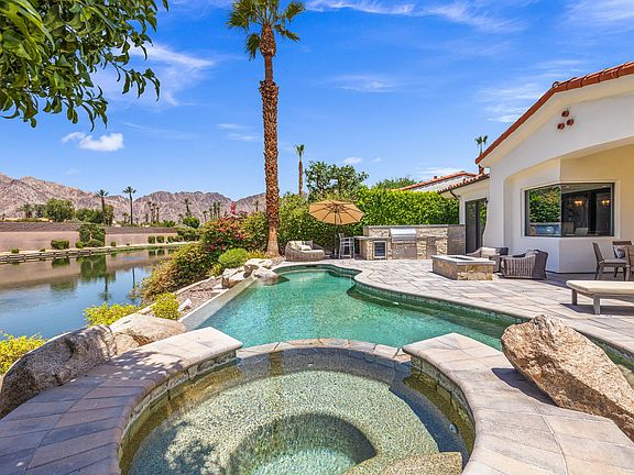 This is the perfect desert retreat for those seeking luxury, convenience, and an un-beatable lifestyle. Featuring 4-bedrooms with separate 2-room casita nestled on a premium lot along the golf course in the gated community of Haciendas at La Quinta. This architecturally refined home offers the ultimate in elevated desert living, with sweeping views of the golf course and surrounding mountains, creating a breathtaking backdrop. The heart of the home is a gourmet chef's kitchen, thoughtfully designed. Outfitted with top-of-the-line designer appliances, including a Sub-Zero refrigerator, wine storage, Wolf range. The Custom cabinetry has glass features and pull outs, Premium Calacatta Quartz jumbo slab countertops, and a large island provide both elegance and function, with all new lighting. This space is ideal for entertaining or intimate gatherings! Each space within the home reflects attention to detail. with high-end luxury finishes, custom built-ins, window treatments, and designer touches throughout. The great room open-concept living seamlessly connect indoor and outdoor spaces, with vaulted ceilings, wood beams and a elegant fireplace. Step outside to your own private resort-style oasis, featuring a salt water pool, hot tub, luxurious fireside setting, custom built in Lynx BBQ, and panoramic vistas of the lush golf course, majestic mountains for the ultimate in privacy. Other features of this home are the Primary bedroom with a king sized bed and views to the beautiful backyard, the primary bathroom has a large walk in shower and soaking bathtub with dual vanity sinks. Primary walk in closet with custom built in features, The guest bedroom on the opposite side of the home has complete privacy and features a Queen bed and its own private remodeled en-suite. The Den which flows off of the kitchen is a great work from home-office and has French- Doors for total elegance. The Separate 2-room casita features a living area, en-suite, and a separate bedroom with another King sized bed, Coffee Bar area with microwave & refrigerator. This Home is Ideally located in the heart of La Quinta, walk or bike to Charming Old town LQ, The famous La Quinta Resort & Spa, close by are world -renowned golf courses, top-rated restaurants, & vibrant entertainment, hiking and biking trails are just minutes away. And for shopping visit the famous El Paseo shopping and entertainment district.