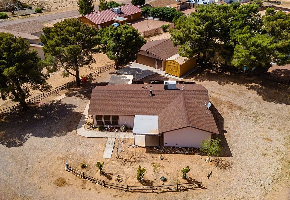 Welcome to this charming rustic-style home nestled on a spacious lot dotted with beautiful mature pine trees in the peaceful high-desert community of Valle Vista. Offering warmth, character, and plenty of elbow room, this property is perfect for those seeking a serene lifestyle just minutes from Kingman. Inside, you’ll find a rustic yet inviting living space with natural textures and a timeless cabin-style feel. Large windows bring in ample natural light and frame the relaxing views of the surrounding pines and mountain ranges. This home is ideal for a full-time residence, weekend getaway, or investment opportunity. Outside, the property truly shines—featuring a detached 2-car garage, a spacious storage shed, and plenty of room for outdoor living, gardening, or recreation. Whether you enjoy quiet evenings under the stars or mornings with coffee listening to the breeze through the trees, this lot provides an ideal retreat. Located in the sought-after Valle Vista community, residents enjoy access to an 18-hole golf course, a community pool, clubhouse, park, and breathtaking desert and mountain views. Don’t miss this unique opportunity to own a rustic gem in one of Kingman’s most charming desert communities!