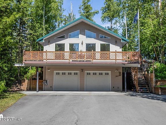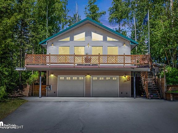 Perfect for all outdoor Alaska enthusiasts AND commuters. In this unique raised ranch floor plan, it is perfectly positioned for convenience and partial mountain views from the second floor. This home has had recent updates including paint and LVP flooring installed in the living areas. There are two bedrooms and two baths on the main level.The basement area houses the built in oversized two car garage, a dumbwaiter/elevator type mechanical area, a garage bathroom, and additional finished living space that could be utilized for a gym, storage, office, etc. The main living area offers vaulted ceilings with custom windows bringing in all the natural light. The driveway to the house is almost completely paved with the exception of the secondary driveway that was put in for the convenience of a "pull-through" option. Landscaping, a 1 bed 1 bath guest cabin that has been rented out for $900+/month in the past, and a detached 4-car shop are all just a few of the additional amenities this property has to offer. The guest cabin is equipped with a 3/4 bath, kitchen/living space, and one bedroom. The detached garage is approximately 925sf with tall ceilings and a large attached 316sf (enclosed) carport on the side. A large additional pad has been put in next to the shop for the purpose of having plenty of parking for RVs, trailers, boats, etc. This location can't get any better for proximity to Mat-Su Regional, central to Palmer and Wasilla, AND not to mention a commuter's dream location as it's just a short 38-minute commute to Anchorage from this home. Come take a look!