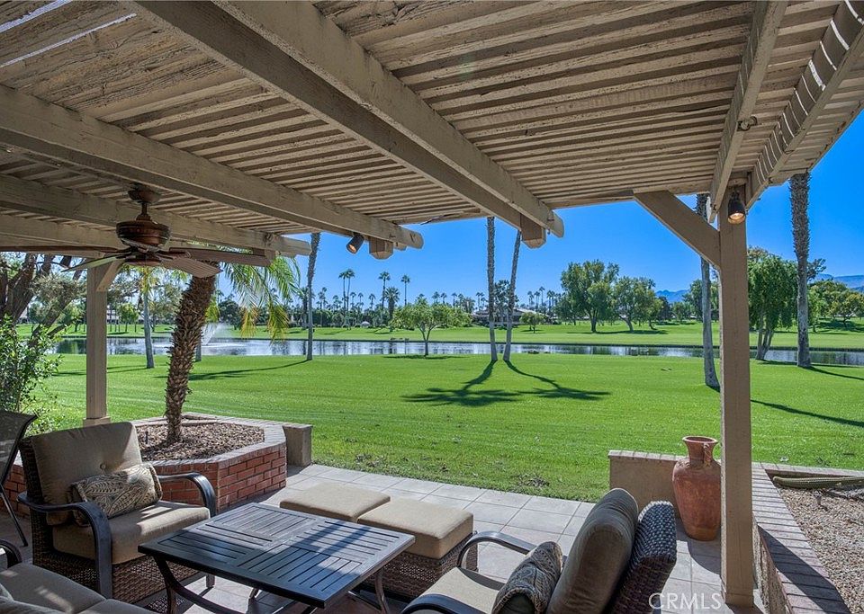 Discover the epitome of desert lifestyle living in this turnkey beauty at Woodhaven Country Club. Perfectly positioned as a south-facing end-unit condo, this home offers exceptional lake, fairway, and mountain views from the private patio—set in a serene greenbelt location safely away from golf balls. Enjoy lawn sports on the expansive greenbelt, where the lake’s fountains and natural wildlife create a tranquil retreat.