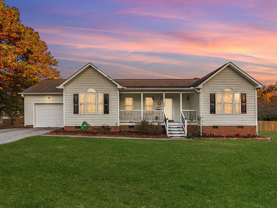 Welcome to this charming ranch home situated on a spacious 0.5-acre lot with no HOA restrictions. A covered front porch invites you into an open family room featuring vaulted ceilings and abundant natural light. Durable luxury vinyl plank flooring extends throughout the home, complementing the fresh interior paint for a move-in-ready feel. This 3-bedroom, 2-bath layout offers comfortable living with a bright and airy atmosphere. The owner's suite, bathed in natural light from large windows, provides a serene retreat with its thoughtful design. Two additional bedrooms offer flexibility for guests, a home office, or other uses to suit your lifestyle. The large fenced backyard includes a thriving mini-garden with sweet peppers, watermelons, tomatoes, and muscadines—ideal for those who enjoy gardening. Outdoor living continues with a sunporch and gazebo, perfect for relaxation or entertaining. Additional highlights include a one-car garage, functional mudroom, convenient laundry closet, and outdoor shed for extra storage. A wonderful combination of comfort, space, and rural charm just minutes from local conveniences.