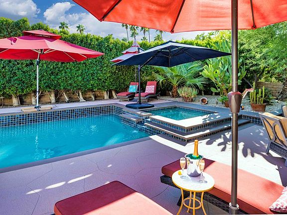 Stop Scrolling-PRICE REDUCED on this rare Find! OWNED SOLAR w/41 panels- set on a premium oversized south-facing lot, a stunning resort-style outdoor entertainment area - the ultimate indoor/outdoor living experience and Country Club environment w/ LOW HOA! Custom large private pool with raised spa, multiple decks, newly expanded covered pergola w/custom-built outdoor kitchen boasts a high-end refrigerator, professional rotisserie BBQ grill and mounted outdoor TV. Impeccable landscaping includes lush grass lawn, carefully curated plants, trees, and succulents.This striking 3 BR, 2.5 bath home is filled w/ natural light and designed for relaxation and entertaining. Inside enjoy soaring ceilings w/open floor a separate bar area with fridge and wine cabinet. A spacious dining and family room compliments the open kitchen equipped w/ stainless steel appliances and natural wood cabinets.Superb additional features include 41 OWNED SOLAR panels and high-powered 60-amp Electric Vehicle ChargePoint charger. Located in serene gated Desert Breezes community. You'll appreciate the beautifully landscaped streets & paths, amenities, tennis & pickle ball courts, multiple pools, newly renovated clubhouse & fitness center. Located near famous Indian Wells Tennis Garden, world class shopping, fine dining, polo fields, theatre, and the new Acrisure arena! You need to see this for yourself!