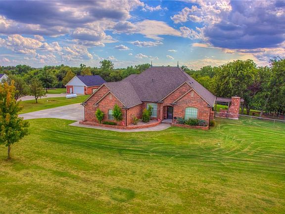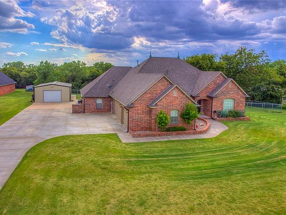 Custom Home in the Rock Creek addition - a private country estate neighborhood with one entrance. Beautiful setting on 1.67 acres, the backyard overlooks a private greenbelt. Exceptional features include custom woodwork w/lots of built-ins and high-quality stained concrete floors; outdoor living spaces w/pergola, outdoor fireplace, recently added inground pool, and outdoor entertainment area; 24X30 insulated workshop; study w/coffered ceiling, 2 desks and wood floor; plantation shutters and walk-in attic. Upstairs, there is a 900 SF bonus room w/ full bath, projector, movie area and wet bar - could be a 4th bedroom on one side. Master bed has hardwood floors and large master bath & closet. The shop is a perfect man cave and there is a 14X30 pad w/dog pen behind it. Located only 2.5 miles from Tuttle Schools and close to major highways for easy commuting to OKC, FAA, Will Rogers Airport, TAFB, Norman, OU, Moore & Mustang. May not GPS - see Map in Photos.