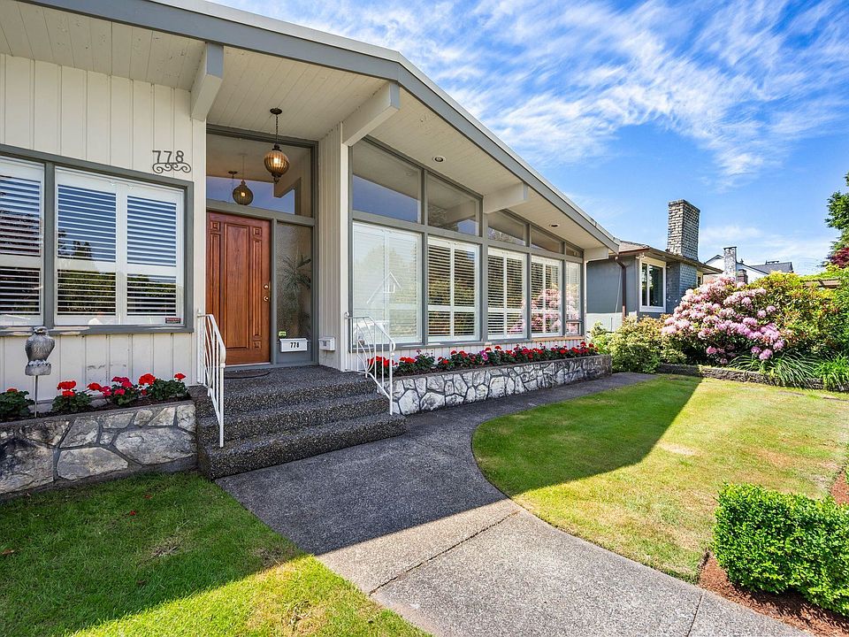 Highly desirable, Mid-Century Modern family home on 62' x 125' extra large lot shows off the classic clean lines, geometric design & large floor-to-ceiling windows that make this style so popular. Natural light floods the large living & dining rooms. Original, refinished HW floors are a delight. Sunny south facing patio is perfect for the summer barbecues. The beautiful, manicured gardens are peaceful & private. 4 bedrooms on the main give you plenty of space for the whole family. Downstairs features a modern 2 bedroom plus a nanny suite. Original staircase still in place so floors can easily be joined back together to make one home. Double car garage plus extra parking & storage. Excellent school catchment: Jamieson Elementary & Hamber Secondary