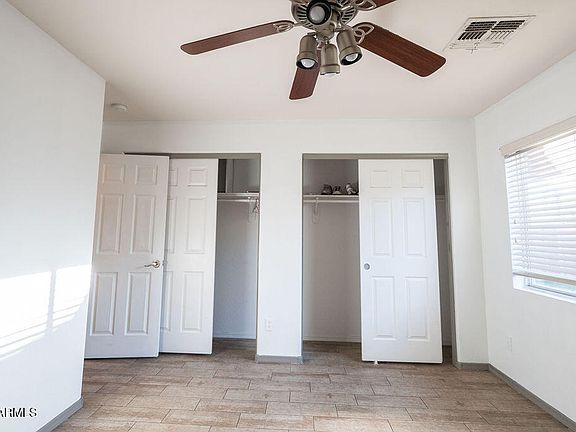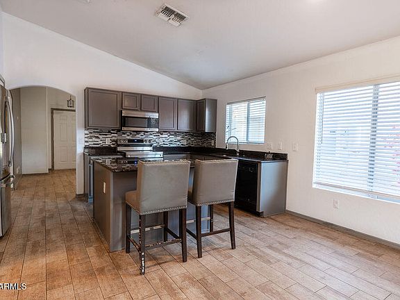 Don't miss this West Valley gem, just minutes from ASU West! This charming single-story home in the desirable Palm Terrace community welcomes you with low-maintenance landscaping and wonderful curb appeal. Inside, you'll find vaulted ceilings, a neutral color palette, and stylish wood-look flooring throughout. The chef-inspired eat-in kitchen shines with fresh paint, beautifully updated gray cabinetry that perfectly matches the backsplash, stainless steel appliances, gleaming granite countertops, a pantry, and a large center island with a breakfast bar ideal for entertaining. Outside, enjoy a backyard built for relaxation, featuring a covered patio, pavers, and lush synthetic grass. Best of all, the community playground park is right in front of the home,ideal for families and outdoor fun