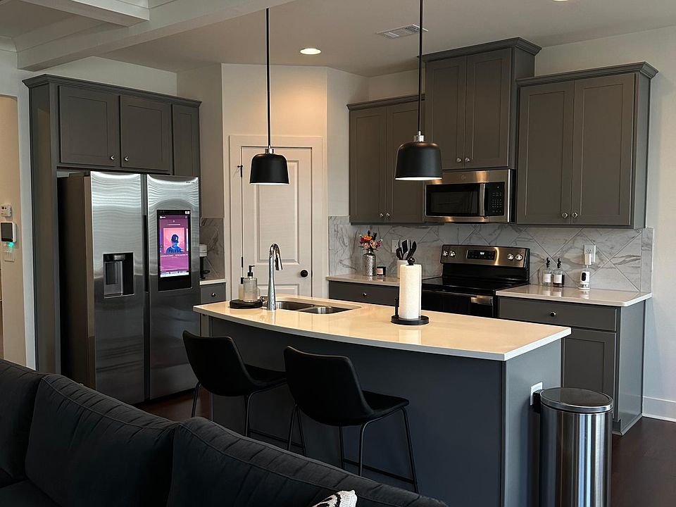 Experience the luxury and comfort in this sophisticated townhome community. This home has three spacious bedrooms and 2.5 baths. Step into the gourmet kitchen that features granite countertops, stainless steel appliances, and a functional kitchen island. The kitchen features 42-inch cabinets with a beautifully tiled backsplash.
