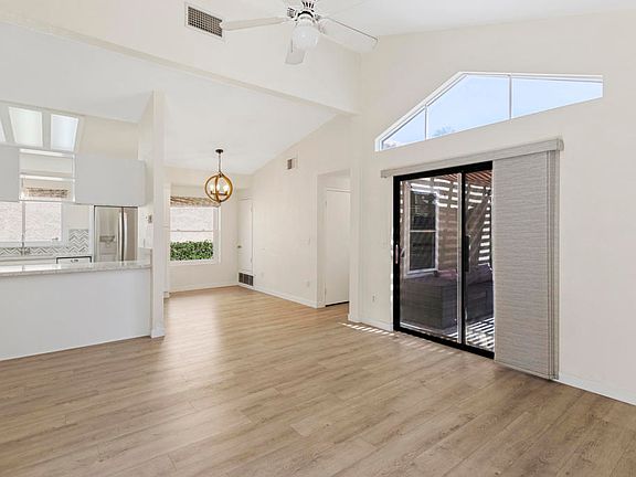 Great opportunity at an unbeatable price in the very desirable gated community of Golden Sun Estates. Beautifully updated home boasts high vaulted ceilings and lots of light, luxury vinyl flooring throughout and open floor plan. The fabulous kitchen features a gas range, quartz countertops and stainless steel appliances. Two well separated bedrooms for privacy. The primary ensuite with lots of closet space, double sinks and walk in shower in the updated bathroom is tucked away on one end of the home. And the guest bedroom on the other side is adjacent to a bathroom and opens to the patio. Step out to the expansive backyard from any of the 3 sliders in the house. Here you will enjoy a large covered patio that backs up to a green belt and with plenty of play area and space for relaxation and alfresco dining. The 2-car garage has tons of storage and the laundry is located inside the house. Golden Sun Estates offers so many amenities... 2 pools and spas, tennis and pickleball, basketball, community clubhouse that can be reserved for private events, billiards, etc. All this and super low HOA dues! You can't beat the prime location just off Washington with easy assess to the 10 freeway and so convenient for all shopping, restaurants, entertainment and schools. Makes a great full time residence, desert retreat or investment property. See it today!
