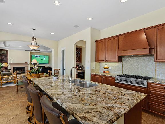 Walls of glass frame stunning mountain and garden views throughout the great room featuring 10' ceilings, crown molding, a glass fireplace, hard-wired speakers, and a security system. The chef's kitchen offers granite counters, tiled backsplash, double ovens, stainless Viking appliances, and a center island with bar seating. A family/media room adjoins the main living area, and the floor plan provides excellent separation with the primary suite set apart from the guest rooms.The property showcases panoramic mountain views front and back on one of the largest lots in gated Hidden Canyon. A resort-style setting includes a cascading waterfall flowing into the sparkling saltwater pool/spa, expansive paver decking, a full-length covered patio, landscape lighting, fire pit, built-in BBQ kitchen, and outdoor shower. An extended driveway for up to 12 vehicles leads to an oversized 3-car garage with new epoxy floors.A private luxury retreat with exceptional indoor-outdoor living in a premier community close to all amenities.