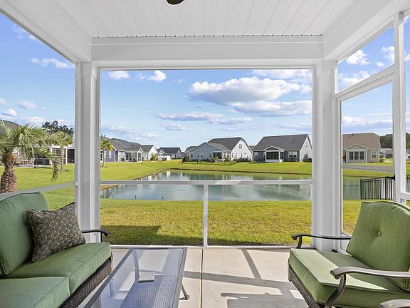 You'll love this bright and cheerful move in ready home with upgrades! Skip the wait! This 3-year young Sea Spray coastal inspired floor plan sits on a premium waterfront lot and features 2 bedrooms on the main level plus versatile flex/guest suite upstairs with full bath and walk in closet. Enjoy a screened porch overlooking the water- perfect for relaxing year-round. Move in ready with plantation blinds, luxury LVP flooring, hurricane window covers, washer/dryer and refrigerator! Quite resort style community with tennis/pickleball courts, large pool, dog park and sidewalks! Why wait to build when this home has it all?