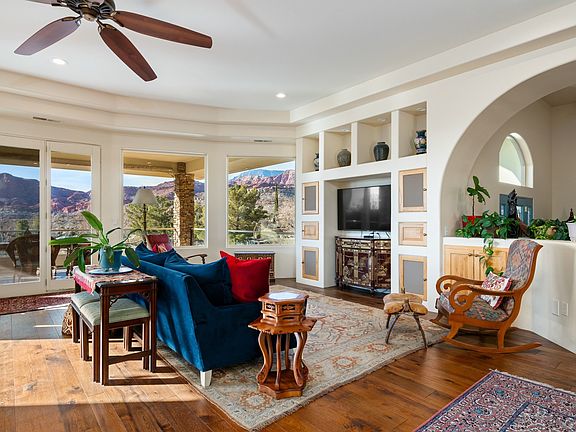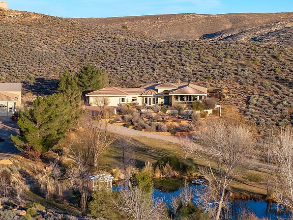 Private 34+ acre gated Southern Utah estate offering rare seclusion, sweeping red rock views, and unobstructed open sky at the end of a paved road. Built by Mark Fahrenkamp in 1999 and extensively updated, the 3-bedroom, 3-bath home with den features a dramatic great room and expansive glass-railed deck capturing stunning sunsets. Below the home, a peaceful bass and bluegill stocked pond with lily pads and gazebo creates a serene retreat. The main residence offers a desirable split-bedroom layout with a spacious primary suite featuring two walk-in closets (one with built-in safe) and a custom bath with dual sinks and walk-in shower. Two additional bedrooms each offer nearby or private 3/4 baths. Major 2017 updates include an enclosed back porch with Indian Temple Door, Art Nouveau fireplace, remodeled kitchen and primary bath featuring custom hand made ceramic tile by K.J. Patterson and new flooring throughout. The gourmet kitchen features a large solid granite island, stainless steel countertops, built-in Wolf induction cooktop and oven, touch-activated sinks, integrated-panel dishwasher, walk-in pantry, and a flexible office/butler's pantry/laundry space. The home connects to an attached 2-car garage with utility sink and laundry hookups. Designed for privacy and flexible living, the property includes a converted cold storage basement into a private mother-in-law apartment with separate entrance providing a 4th bedroom and bathroom, kitchenette, full bath, walk-in closet, and studio space. Additional features include an RV garage with mezzanine and multiple entry points, a barn garage (both built into bedrock), plus a bathroom located in the garage/workshop loft. The home is equipped with a whole-house generator with 500-gallon propane tank, two HVAC systems, three hot water tanks, whole-home vacuum and water softener, fire pit, greenhouse, caged garden beds, and drip irrigation. The property includes six culinary water allotments with ASSSD, 1.75 irrigation shares with Leeds Water Company, spans three parcels, and offers future subdivision potential (buyer to verify). A rare opportunity to own a secure, private retreat combining luxury living, water, infrastructure, and long-term self-sufficiency in Southern Utah.