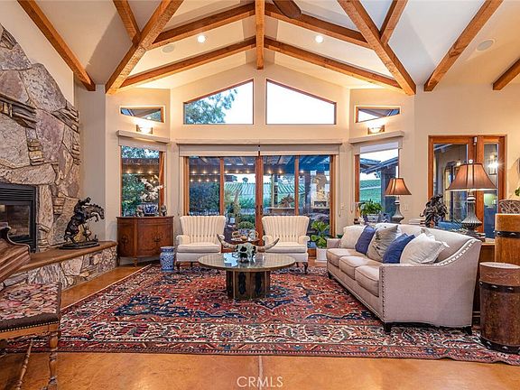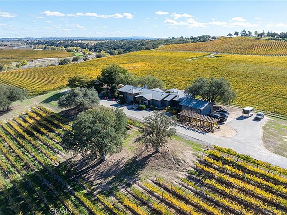 This elegant and functional wine country estate comprises approximately 93± acres in Paso Robles’ prized Estrella Sub-Appellation. It includes an excellent quality producing vineyard of approximately 71.5± acres planted to Cabernet Sauvignon, Petite Sirah, and Sauvignon Blanc. The main residence spans roughly 3,004± sq. ft. and provides sophisticated amenities for both daily living and entertaining, including seamless indoor-outdoor flow with a lap pool, outdoor kitchen, climate-controlled wine cellar, and sweeping vineyard views. Inside, the 2-bedroom, 2.5-bath layout showcases vaulted ceilings, exposed beam architecture, and high-end finishes throughout. The gourmet kitchen features stainless steel appliances, a central island with prep sink and bar seating, plus a breakfast nook overlooking the vines. The primary suite offers a spa-inspired bathroom with dual vanities, soaking tub, walk-in shower, and direct access to a private patio. A detached 576± sq. ft. casita with a full kitchen and bathroom provides additional flexibility—ideal for guest accommodations, an office retreat, or hobby studio. Outdoor living is equally inviting with a covered patio, built-in BBQ, pizza oven, refrigerator, bocce court, and a beautifully landscaped garden with upgraded irrigation. Equestrian enthusiasts will appreciate the custom five-stall Barnmaster barn (completed in 2022) featuring a tack room, wash rack, covered porch, water tank, and tankless water heater. The property also includes a 2,273± sq. ft. guest house with three bedrooms, two bathrooms, multiple living spaces, and a fenced yard—accessible via a private driveway. Additional highlights include an arena, equipment storage, a detached two-car garage, and paved driveways. Just minutes from downtown Paso Robles, this exceptional estate blends refined living, productive vineyards, and tranquil countryside surroundings into one remarkable offering.