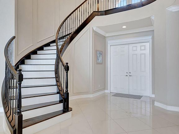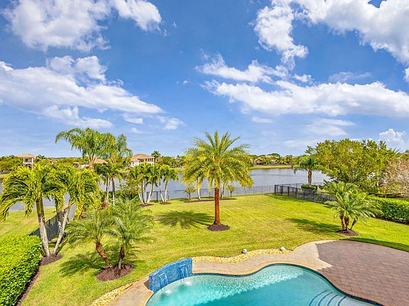 Elegance exudes throughout this architecturally designed home situated on a lake front 1/2 Acre lot. Porcelain tiled flooring, coffered ceilings, designer window treatments, hardware & lighting throughout living areas. 4 BR, 4.5 Baths plus office & game/playroom, 2 upstairs balconies, & 4 car garage. Gourmet kitchen with upscale SS appliances, center island, soft close wood cabinetry offering tranquil views of the pool & lake. Exquisite en-suite master with wood flooring, sitting area, his & hers oversize closets. Luxurious bath: his & hers vanities, glass shower & roman tub. 2 additional en-suite BR's. Stunning wooden spiral staircase leading upstairs. Freeform salt water/heated pool & lanai. Impact windows throughout, 2 new A/C's 2024. Upgraded & beautifully enhanced lighted landscaping As you enter this masterpiece you are greeted by polished porcelain floors, soaring 20-24' coffered ceilings with crown moldings. This spacious light & bright home features all the bells & whistles. Designer window treatments including plantation shutters & light fixtures. Huge 20' primary bedroom features wood floors and a sitting area. Large His/her California closets offer ample room. Luxurious master bathroom features his/her vanities, separate tub & glass shower. Plenty of room for your collector cars with this spacious 4 car garage. Meticulously maintained including 2 new Lennox Ac units with UV lights, new GE Smart washer & dryer & new sprinkler pump which brings water from the lake. Crown molding throughout and triple 6" crown in the great room with double coffered ceiling. AN abundance of decorative moldings around doors windows and on walls. Dozens of LED high hat lights. The highly upgraded & beautifully enhanced landscaping featuring mature & Majestic Royal Palms and landscape lighting. Upstairs has a second master suite as well as a 18' x19' playroom or possible theater with a covered 20'x10 covered porch off of it overlooking the large fenced yard, lake and fountain. A perfect family entertaining room. This gated sought after community features a kids playground, tennis, basketball and an open field for kids soccer or ...